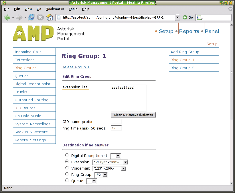 В разделе Ring Groups мы несколькими движениями мышки можем объединить абонентов в единую группу вызова. Кроме того, также имеется возможность задать альтернативное поведение системы для случаев, когда ни один из абонентов группы не доступен (см. рис. 9).
