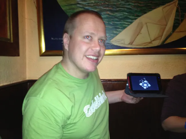 В свою очередь, разработчик драйвера Lima (драйвер для графического сопроцессора Mali, применяемого во многих чипах на основе архитектуры ARM), Люк Верхеген (Luc Verhaegen) продемонстрировал достаточно сложную 3D-сцену, обсчитываемую его драйвером. В данный момент наборы команд шейдерных процессоров удалось установить и все шейдеры сцены были ассемблированы без использования проприетарного компилятора. Из нерешенных проблем в данный момент остается отсутствие открытого компилятора который бы автоматически генерировал из шейдеров код для шейдерных процессоров в автоматическом режиме (на фотографии разработчик демонстрирует 3D сцену обсчитываемую его драйвером).