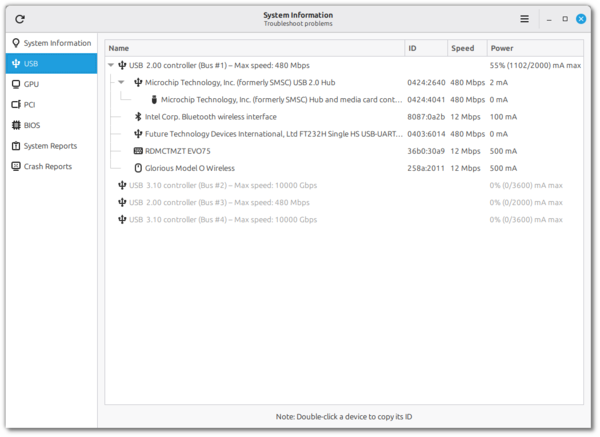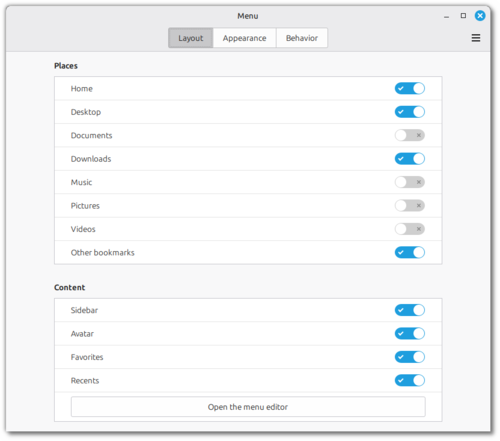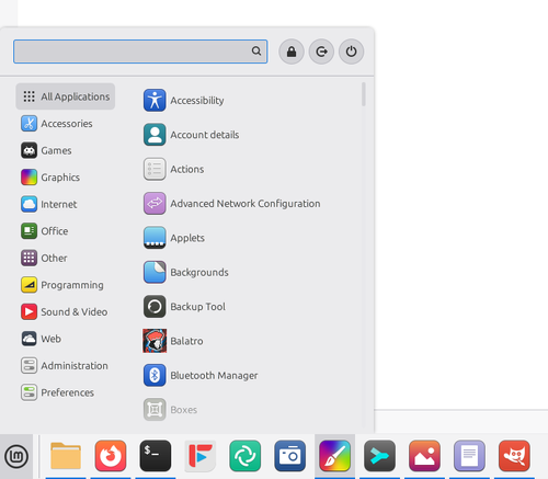 >Список категорий программ в меню оформлен более компактно, для наглядного выделения категорий задействованы символьные пиктограммы. Системные кнопки (блокировка экрана, спящий режим, выключение) перенесены в верхний правый угол, но добавлены настройки, позволяющие переместить их в нижнюю часть меню приложений или боковую панель.