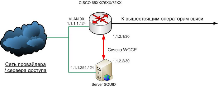 WCCP (Web Cache Communication Protocol) на сервер(а) SQUID. Данная схема